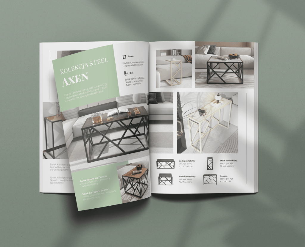 Na tych założeniach powstał katalog produktowy wraz z cennikiem, zaprojektowany w estetyce modernizmu i w pełni dopasowany do wizji marki.